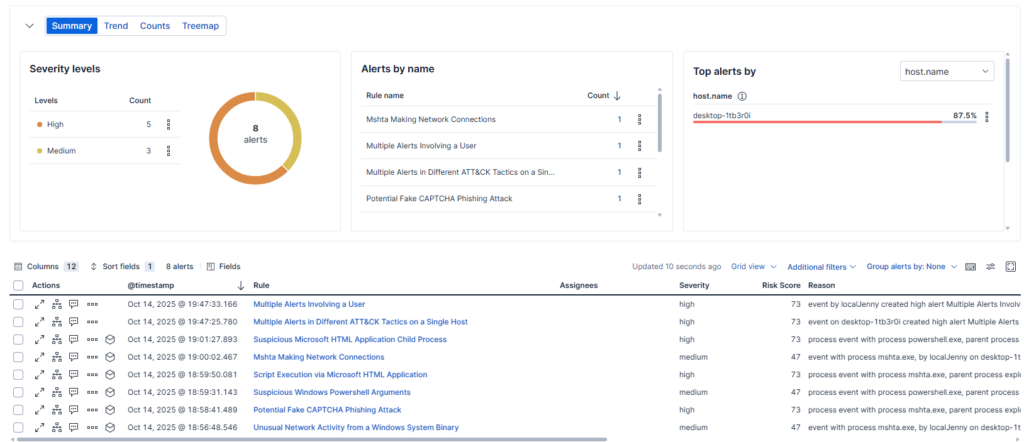 At this point, although Elastic has been lit up, while not in prevent mode, the attack was able to fire off. Looking at these 8 alerts, we can immediately make some determinations.