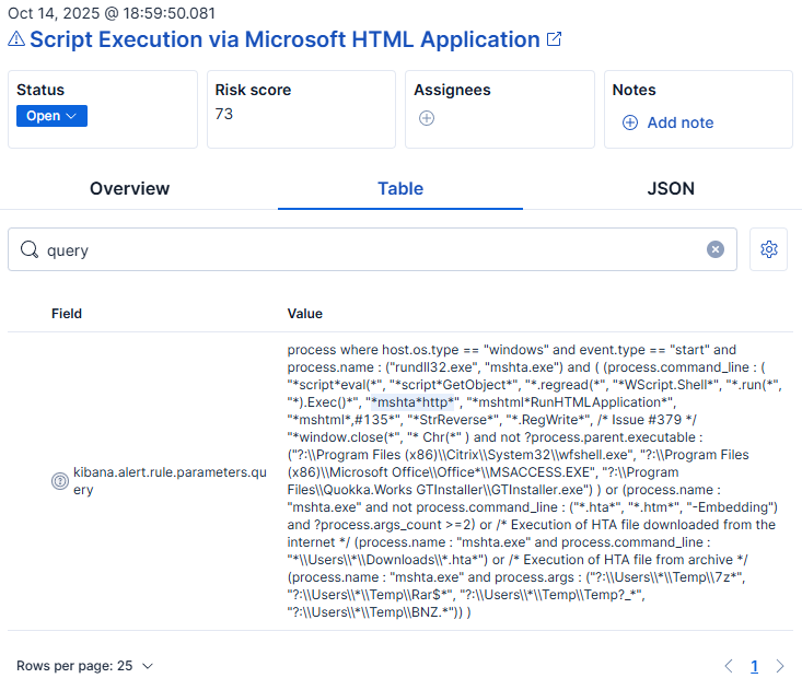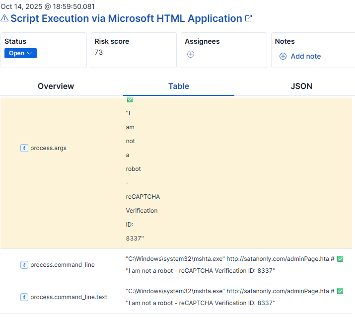 From these alerts, we can identify a few artifacts and indicators of compromise. Looking at the “Script Execution via Microsoft HTML Application” we can identify abuse of MSHTA including the command line from earlier. Notice this is not recognizing the relation between MSHTA spawning PowerShell or creating the oShell shell object