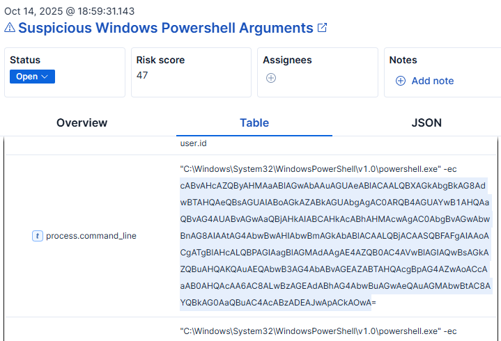 Looking at any of the PowerShell alerts, we can next extract the encoded command as a possible IoC. We should also narrow down our searches using either the process PID, host name, or user name.