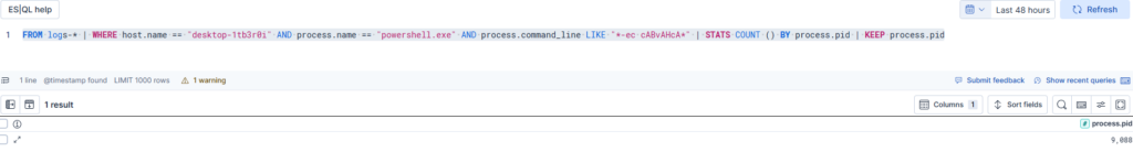 FROM logs-* | WHERE host.name == "desktop-1tb3r0i" AND process.name == "powershell.exe" AND process.command_line LIKE "*-ec cABvAHcA*" | STATS COUNT () BY process.pid | KEEP process.pid