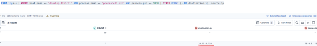 FROM logs-* | WHERE host.name == "desktop-1tb3r0i" AND process.name == "powershell.exe" AND process.pid == 9088 | STATS COUNT () BY destination.ip, source.ip