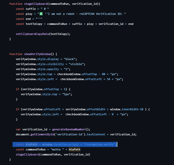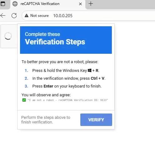 Appearing as a legitimate captcha verification, and with the ability to further embed into more advanced impersonating sites, this phish has proven effective in tricking users into arbitrary code execution. It instructs the users to press Win key + R ultimately launching the Windows Run Dialogue box to run the LOLBin MSHTA.exe to run malicious hta files, or PowerShell to run encoded PowerShell.