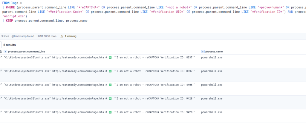 | WHERE (process.parent.command_line LIKE "*reCAPTCHA*" OR process.parent.command_line LIKE "*not a robot*" OR process.parent.command_line LIKE "*prove*human*" OR process.parent.command_line LIKE "*mshta*http*" OR process.parent.command_line LIKE "*Verification Code*" OR process.parent.command_line LIKE "*Verification UID*" OR process.parent.command_line LIKE "*Verification ID*") AND process.name.caseless IN ("powershell.exe", "cmd.exe", "wscript.exe")