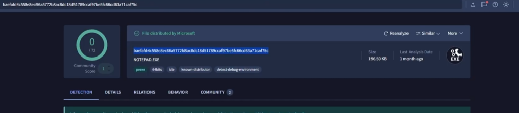 Using the PID to search for a file hash, we can similarly identify this is the legitimate notepad.exe process that has been injected, hollowed, or otherwise co-opted. Another sidenote here, notepad.exe rarely needs to make network connection outside of possibly accessing .txt files on network shares. The process is updated through Windows updates, unlike notepad++. This says nothing of the hostname, whoami, and ipconfig processes. Any analyst that seems something like the above, should immediately engage IR.
